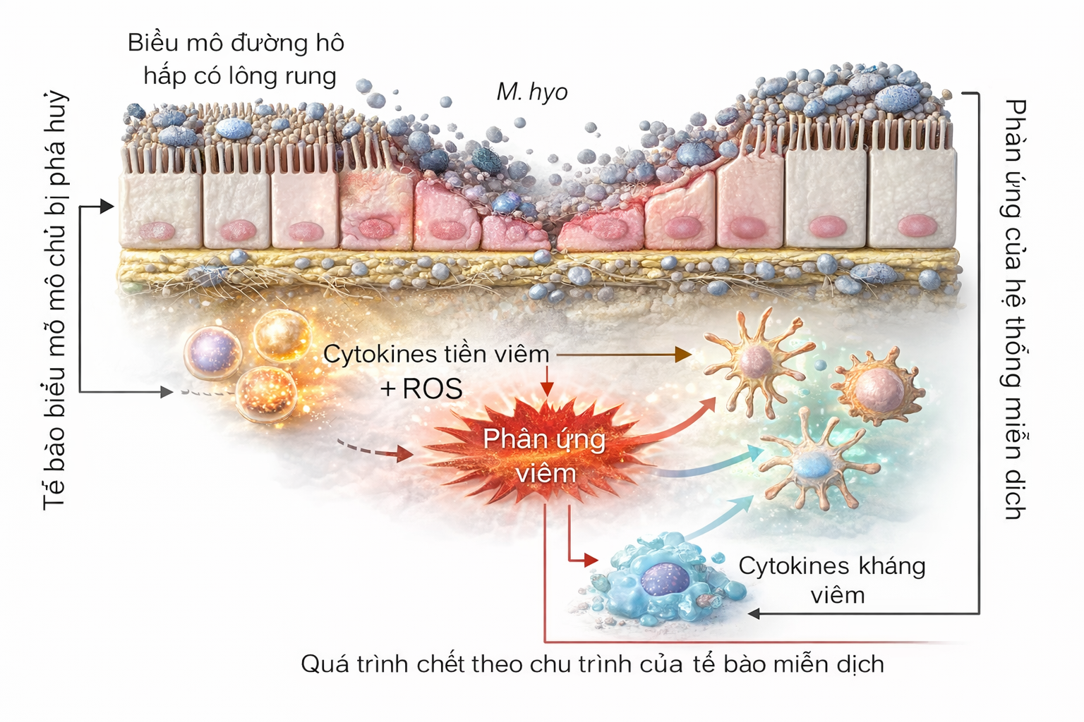 Heo nhiễm đồng thời PRRSv và M. hyo cũng có nồng độ các cytokin IL1-B, IL-6, IL-10 và IL-12 cao hơn đáng kể so với heo âm tính hoặc chỉ nhiễm M. hyo. Các cytokin này làm tăng phản ứng viêm gây viêm phổi nặng và mãn tính. Bên cạnh đó, do sự đồng nhiễm tăng tiết cả IL-10 và IL-12 đã làm thay đổi sự cân bằng giữa 2 yếu tố này. Trong khi IL-12 thúc đẩy đáp ứng miễn dịch qua trung gian tế bào, hoạt hóa tế bào NK, đại thực bào thì IL-10 ức chế hoạt động của đại thực bào, tế bào trình diện kháng nguyên và ức chế đáp ứng Th1. Ngoài ra, IL-10 ức chế quá trình đại thực bào chết theo chu trình nên tăng số lượng các đại thực bào dễ bị nhiễm mầm bệnh. Từ đó ảnh hưởng đến chức năng của đại thực bào dẫn đến rối loạn đáp ứng miễn dịch (Thanawongnuwech R. và cộng sự, 2003).