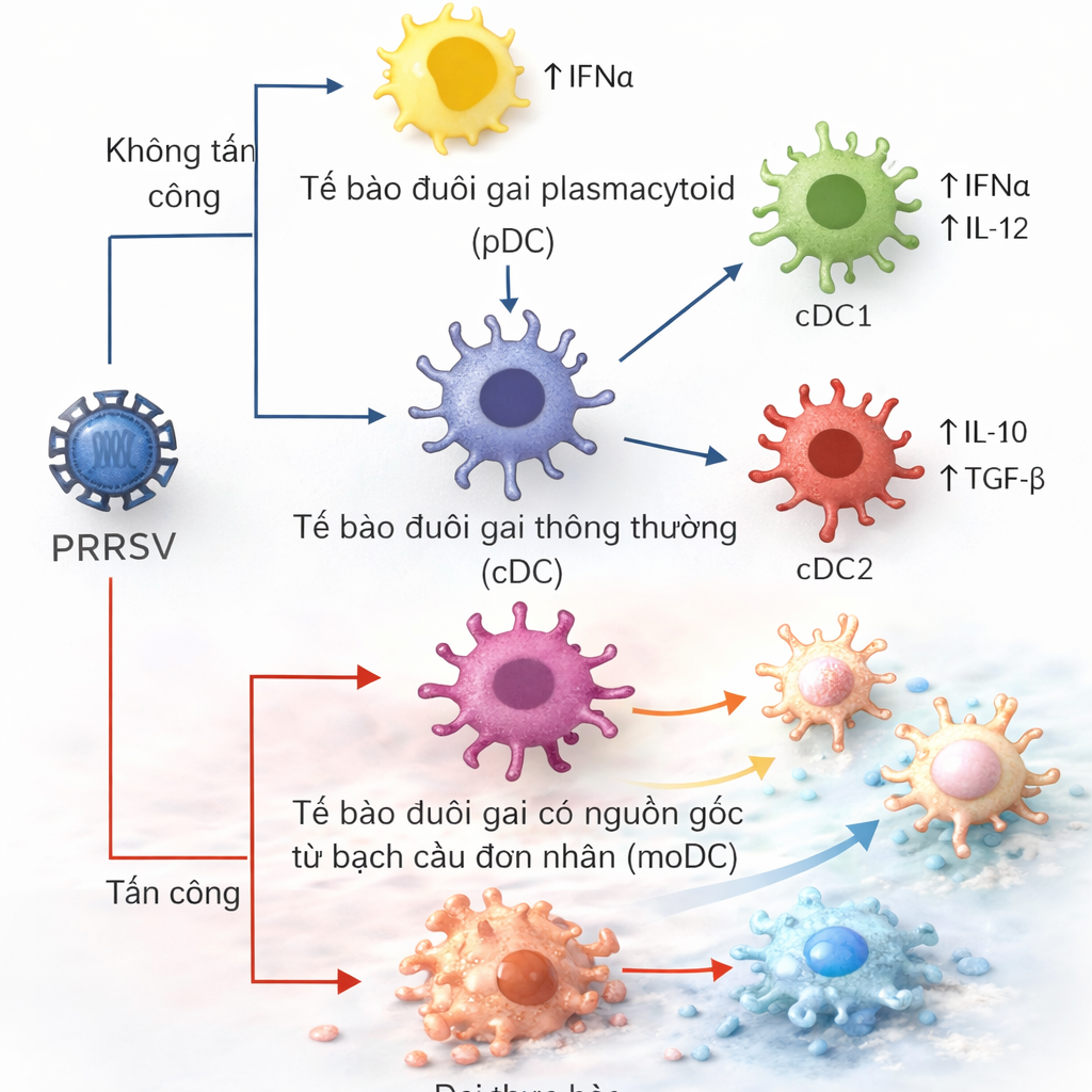 Khi heo nhiễm PRRSV -> sẽ tăng sản xuất các cytokine tiền viêm như TNFα, IL-1, IL-6 và IL-10. Trong đó, IL-10 -> gây ức chế phản ứng miễn dịch trung gian tế bào và trình diện kháng nguyên.
