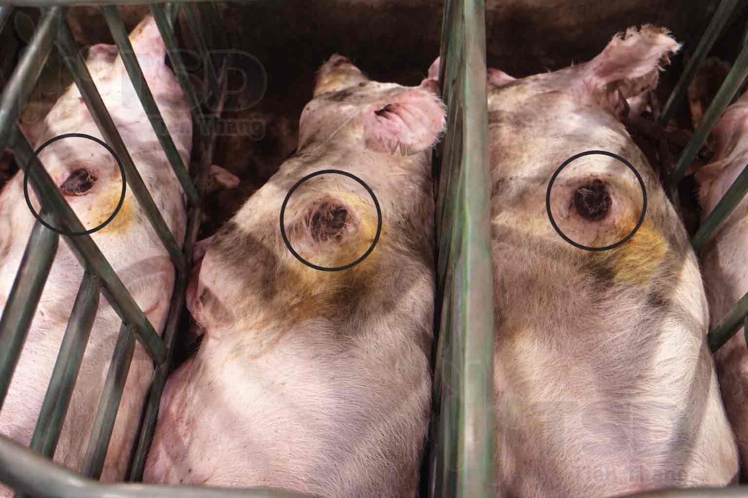 Sau khi nuôi con nên bỏ qua một chu kỳ lên giống. Như hình chụp ở trên, nái nuôi con bị giảm cân quá mức khiến lớp mỡ bảo vệ vai thiếu, nái dễ bị tổn thương vai. Những nái có vết thương lớn có thể bị đào thải.