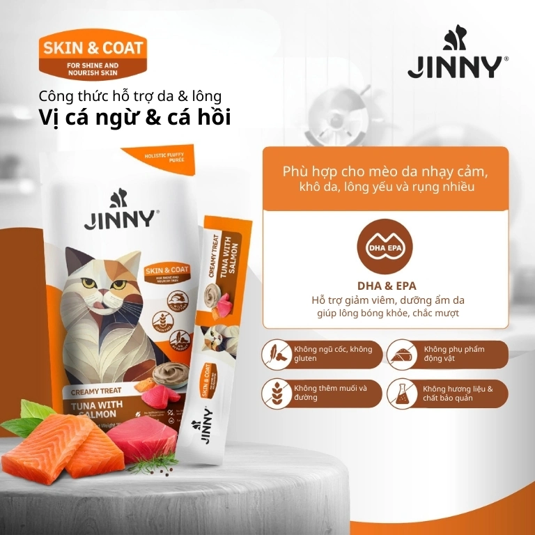 - Jinny Tuna with Salmon – Vị Cá Ngừ & Cá Hồi (Gói Xanh Lá): Sự kết hợp giữa cá ngừ và dầu cá hồi tạo nên dòng Súp thưởng Jinny Creamy Treats giàu dưỡng chất cho ngoại hình.