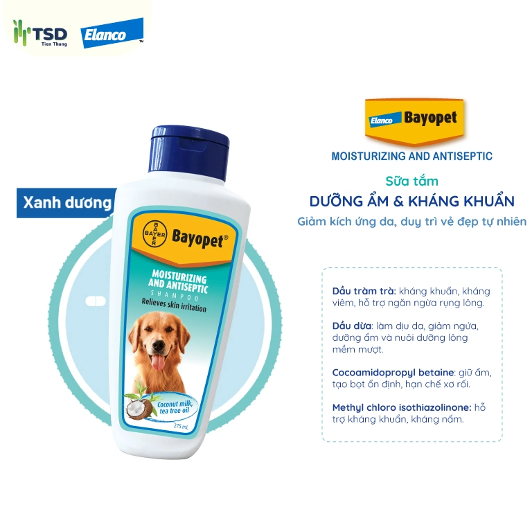 Sữa tắm Bayopet Moisturizing & Antiseptic Shampoo – sữa tắm kháng khuẩn và dưỡng ẩm cho chó, chứa tinh dầu tràm trà & dầu dừa giúp làm dịu da, giảm ngứa, ngăn viêm da và phục hồi lớp dầu tự nhiên. Lựa chọn lý tưởng cho chó da nhạy cảm hoặc đang bị viêm da, đồng thời giúp lông mềm mượt và khỏe mạnh.