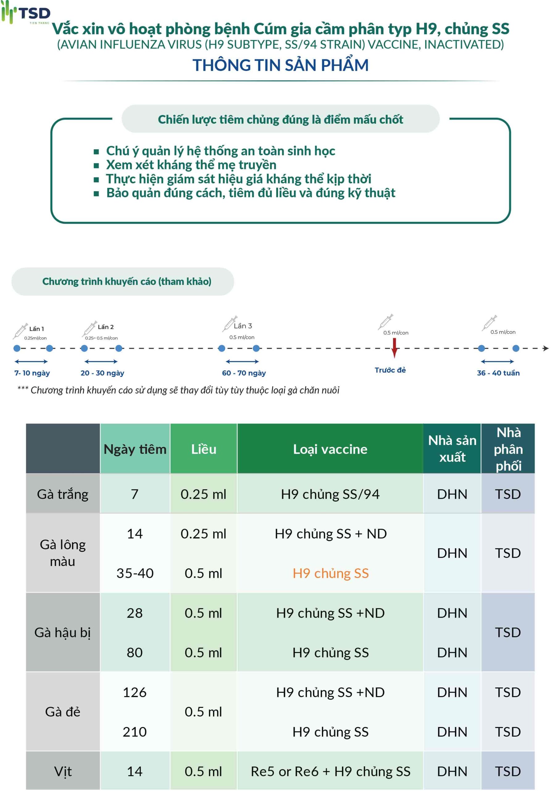 Vì vậy, tiêm phòng Vaccine Cúm gia cầm phân typ H9, chủng SS, vô hoạt là biện pháp chủ động và tối ưu nhất. Vaccine giúp gà tạo miễn dịch bền vững, giảm mức độ nghiêm trọng của bệnh, và quan trọng nhất là kiểm soát sự lây lan trong trại. Đây là bước then chốt để bảo vệ đàn gà, đảm bảo hiệu quả sản xuất và duy trì an toàn sinh học.