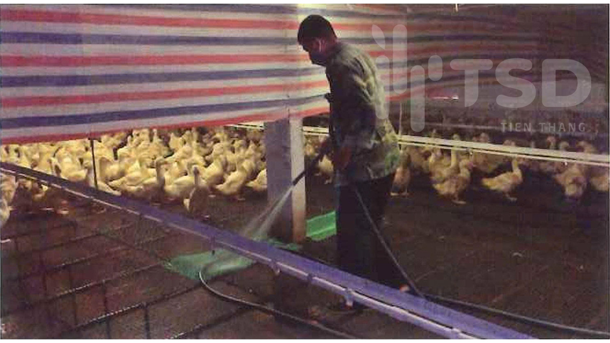 Các tấm sàn ngâm trong dung dịch xà phòng 5%, sau đó rửa sạch bằng máy xịt áp lực cao, bao gồm toàn bộ sàn, nền, tường và mái chuồng.